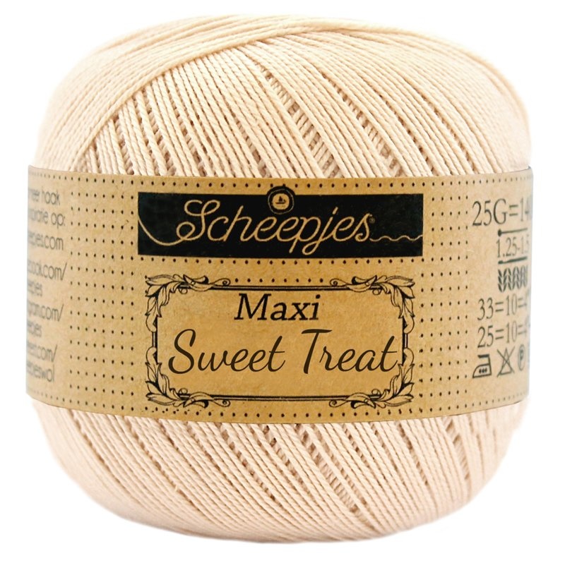 Scheepjes Maxi Sweet Treat is een zeer fijn (garendikte Lace) gemerceriseerd garen van 100% katoen. Een bol weegt 25 gram en heeft een looplengte van 140 meter.