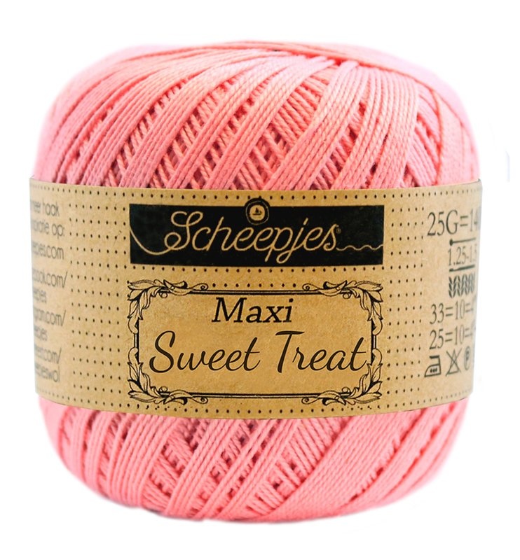 Scheepjes Maxi Sweet Treat is een zeer fijn (garendikte Lace) gemerceriseerd garen van 100% katoen. Dit garen is ideaal voor opengewerkte brei- of haakpatronen, zoals ajourbreien, kantbreien of filethaakwerk, maar natuurlijk ook voor luchtige kleding of accessoires, zoals nettasjes, geurzakjes, gordijntjes, kleedjes of mandala's. Scheepjes Maxi Sweet Treat heeft het EN 71-3 keurmerk, wat aangeeft dat dit garen veilig is in gebruik voor personen met een gevoelige huid, met name veilig voor speelgoed voor baby's en kinderen. Dat maakt dit garen tot een veilige keus voor bijvoorbeeld babydekentjes, knuffels of amigurumi. Bij de productie is gebruikgemaakt van een volledig biologische afvalwaterzuivering, waardoor het gebruikte water op een veilige manier gerecycled en hergebruikt wordt. Scheepjes Maxi Sweet Treat heeft een subtiel glansje en een sterk getwijnde draad, wat uw brei-, haak- of weefwerk een mooie gladde afwerking geeft. Scheepjes Maxi Sweet Treat is verkrijgbaar in 87 verschillende kleuren.