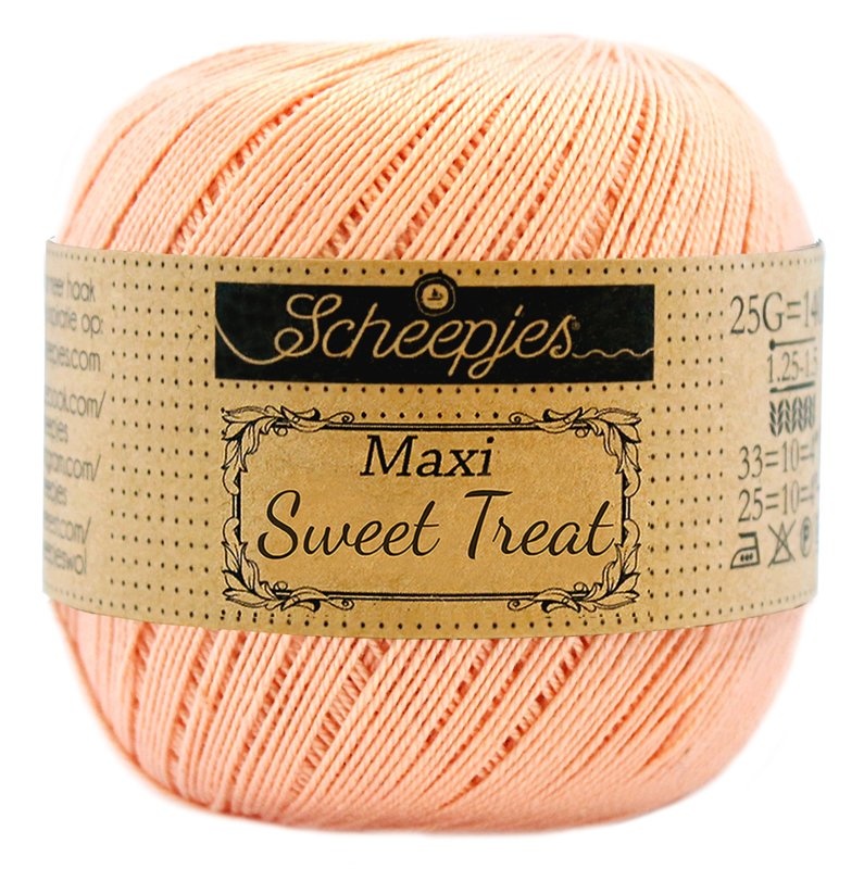 Scheepjes Maxi Sweet Treat is een zeer fijn (garendikte Lace) gemerceriseerd garen van 100% katoen. Een bol weegt 25 gram en heeft een looplengte van 140 meter.