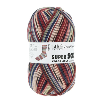 Lang Yarns Super Soxx 4-Ply is een kleurrijk 4 draads sokkenwol van een mix van wol en polyamide. Met 1 bol brei je een paar sokken (maat 36 - 46) met een streep patroon. Op 1 bol zit 100 gram en 420 meter. De aanbevolen naalddikte is 2,5 - 3,5 mm. Naast