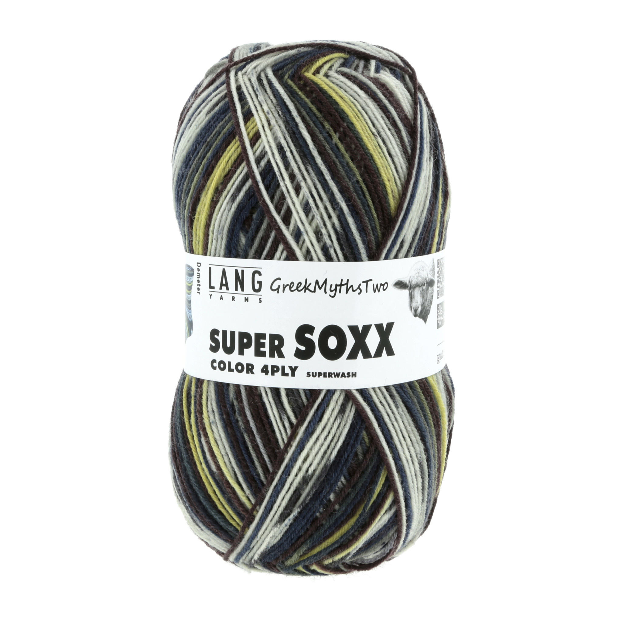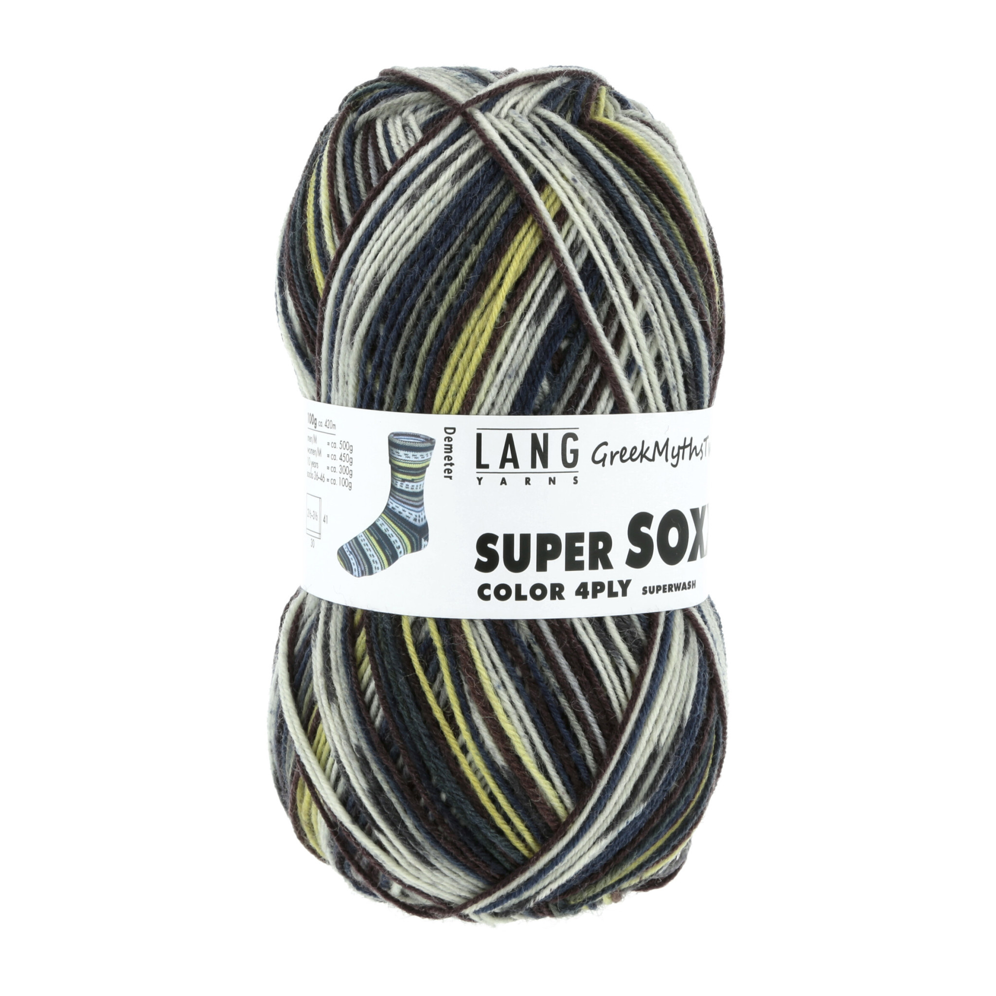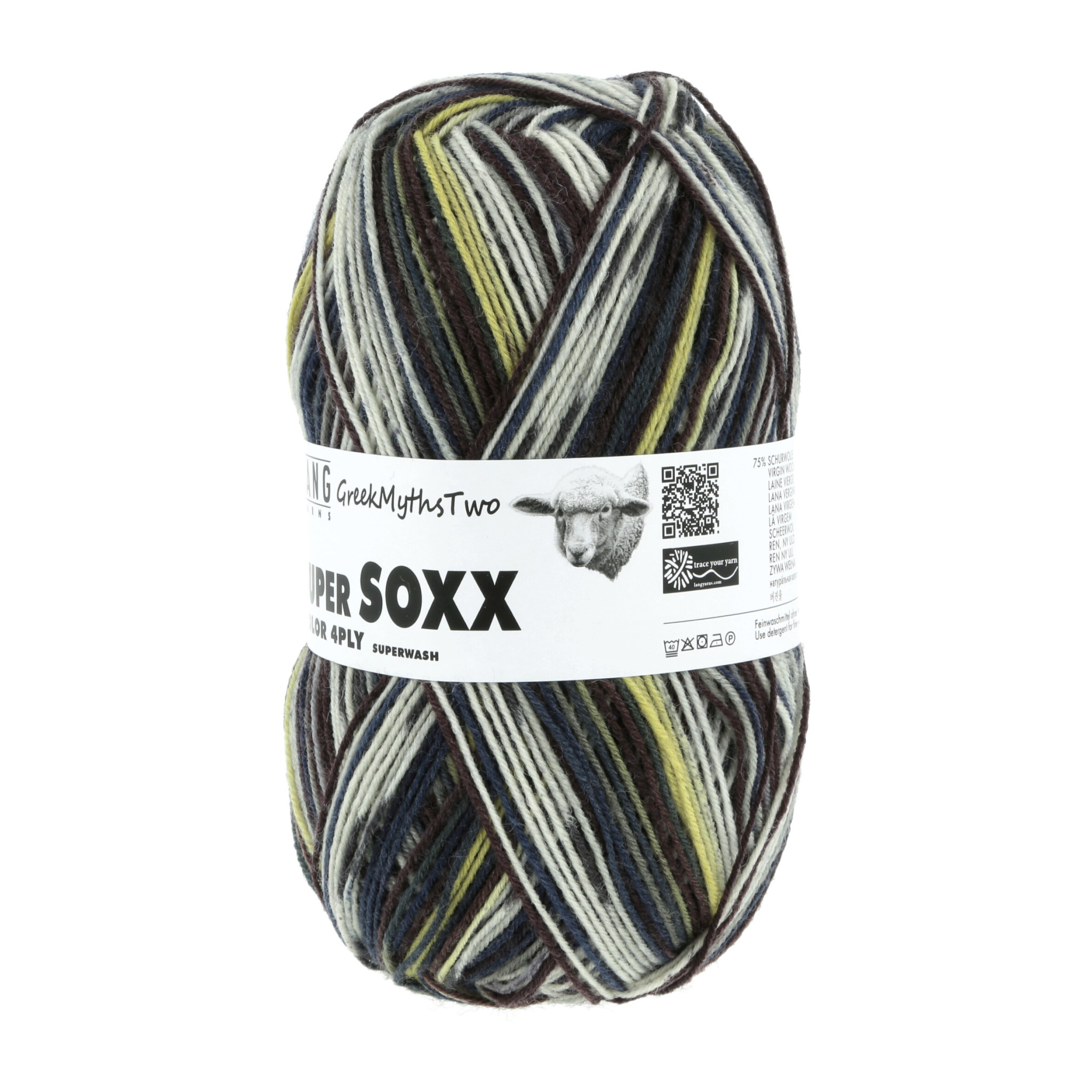 Lang Yarns Super Soxx 4-Ply is een kleurrijk 4 draads sokkenwol van een mix van wol en polyamide. Met 1 bol brei je een paar sokken (maat 36 - 46) met een streep patroon.
